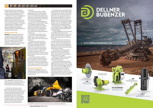 RESEMIN, the Lima-based manufacturer of underground drilling equipment, has unveiled its latest innovation in the BEV space: the e-TROIDON 55. Developed in Peru, this compact jumbo is specifically designed for medium-section mining, featuring a narrow 1.85 m width and a highperformance HC95 21 kW drifter. components. At the heart of the jumbo is a NMC battery system with an installed capacity of 77.7 kWh. Engineered to comply with rigorous international safety protocols and standards, the battery pack is designed for high-demand cycles, featuring a 1C charge rate and a 2C discharge rate.
