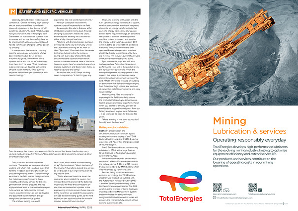 Byrd, meanwhile, says electrification is changing how Caterpillar thinks about performance – not just at the product level, but across entire operations.“ From the energy that powers your equipment to the support that keeps it performing, every element must work in perfect harmony,” he said.“ That’ s why we’ re focused on building an ecosystem that delivers what you expect from Caterpillar: high uptime, low total cost of ownership, reliable performance and easy serviceability.”