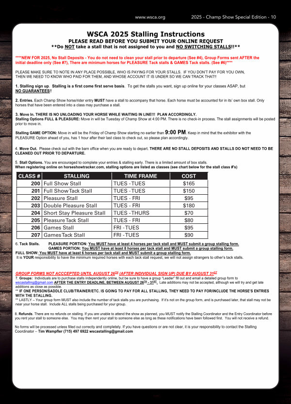 **** NEW FOR 2025, No Stall Deposits- You do not need to clean your stall prior to departure( See # 4), Group Forms sent AFTER the initial deadline only( See # 7), There are minimum horses for PLEASURE Tack stalls & GAMES Tack stalls.( See # 6)****