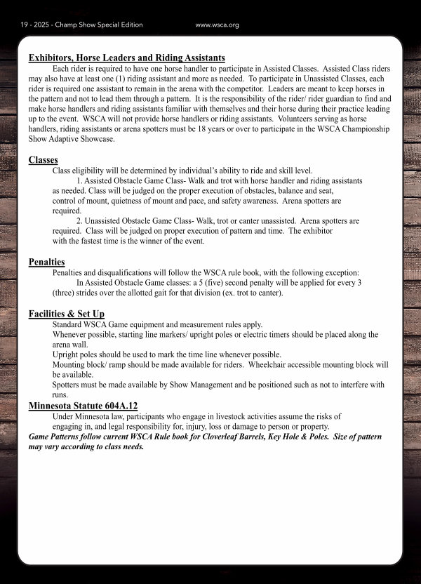 Each rider is required to have one horse handler to participate in Assisted Classes. Assisted Class riders may also have at least one( 1) riding assistant and more as needed. To participate in Unassisted Classes, each rider is required one assistant to remain in the arena with the competitor. Leaders are meant to keep horses in the pattern and not to lead them through a pattern. It is the responsibility of the rider / rider guardian to find and make horse handlers and riding assistants familiar with themselves and their horse during their practice leading up to the event. WSCA will not provide horse handlers or riding assistants. Volunteers serving as horse handlers, riding assistants or arena spotters must be 18 years or over to participate in the WSCA Championship Show Adaptive Showcase.