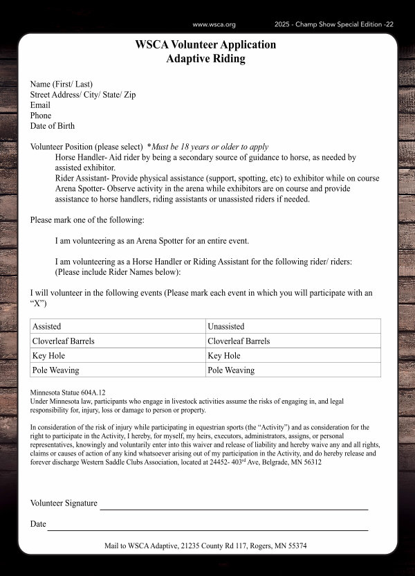 In consideration of the risk of injury while participating in equestrian sports( the“ Activity”) and as consideration for the right to participate in the Activity, I hereby, for myself, my heirs, executors, administrators, assigns, or personal representatives, knowingly and voluntarily enter into this waiver and release of liability and hereby waive any and all rights, claims or causes of action of any kind whatsoever arising out of my participation in the Activity, and do hereby release and forever discharge Western Saddle Clubs Association, located at 24452- 403 rd Ave, Belgrade, MN 56312