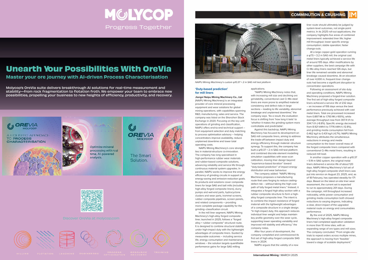 The company added:“ NAIPU Mining Machinery proposes a manufacturing route that uses forging to reduce castingdefect risk – without taking the high-cost path of fully forged metal liners.” Instead, it integrates a forged high-alloy section with a rubber composite structure to form a highalloy forged composite liner. The intent is to combine the impact resistance of forged material with the lightweight advantages of a composite structure in a single design.“ In high-impact duty, this approach reduces individual liner weight and helps maintain key profile geometry over the wear cycle, supporting lower operating variability and improved mill stability and efficiency,” the company notes.