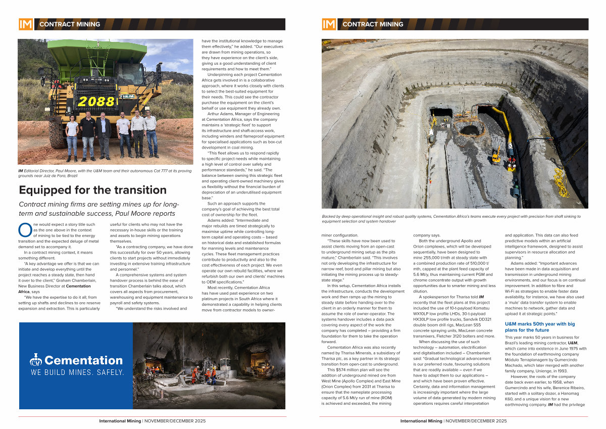 Arthur Adams, Manager of Engineering at Cementation Africa, says the company maintains a‘ strategic fleet’ to support its infrastructure and shaft-access work, including winders and flameproof equipment for specialised applications such as box-cut development in coal mining.