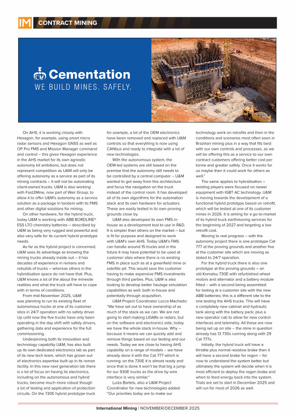 On AHS, it is working closely with Hexagon, for example, using smart micro radar sensors and Hexagon GNSS as well as OP Pro FMS and Mission Manager command and control – this gives Hexagon experience in the AHS market for its own agnostic autonomy kit ambitions, but does not represent competition as U & M will only be offering autonomy as a service as part of its mining contracts – it will not be automating client-owned trucks. U & M is also working with Fast2Mine, now part of Weir Group, to allow it to offer U & M’ s autonomy as a service solution as a package in tandem with its FMS and other digital solutions for mining.