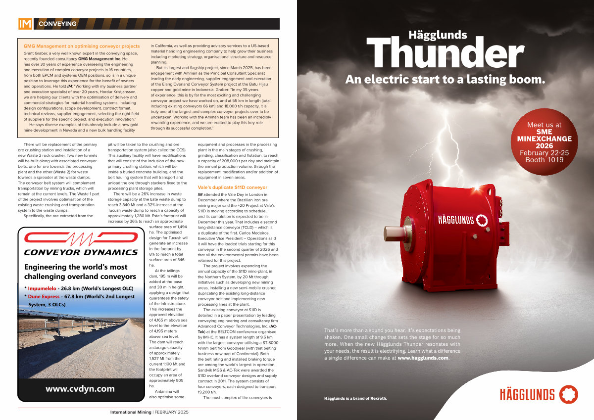 But its largest and flagship project, since March 2025, has been engagement with Amman as the Principal Consultant Specialist leading the early engineering, supplier engagement and execution of the Elang Overland Conveyor System project at the Batu Hijau copper and gold mine in Indonesia. Graber:“ In my 35 years of experience, this is by far the most exciting and challenging conveyor project we have worked on, and at 55 km in length( total including existing conveyors 66 km) and 18,000 t / h capacity, it is truly one of the largest and complex conveyor projects ever to be undertaken. Working with the Amman team has been an incredibly rewarding experience, and we are excited to play this key role through its successful completion.”
