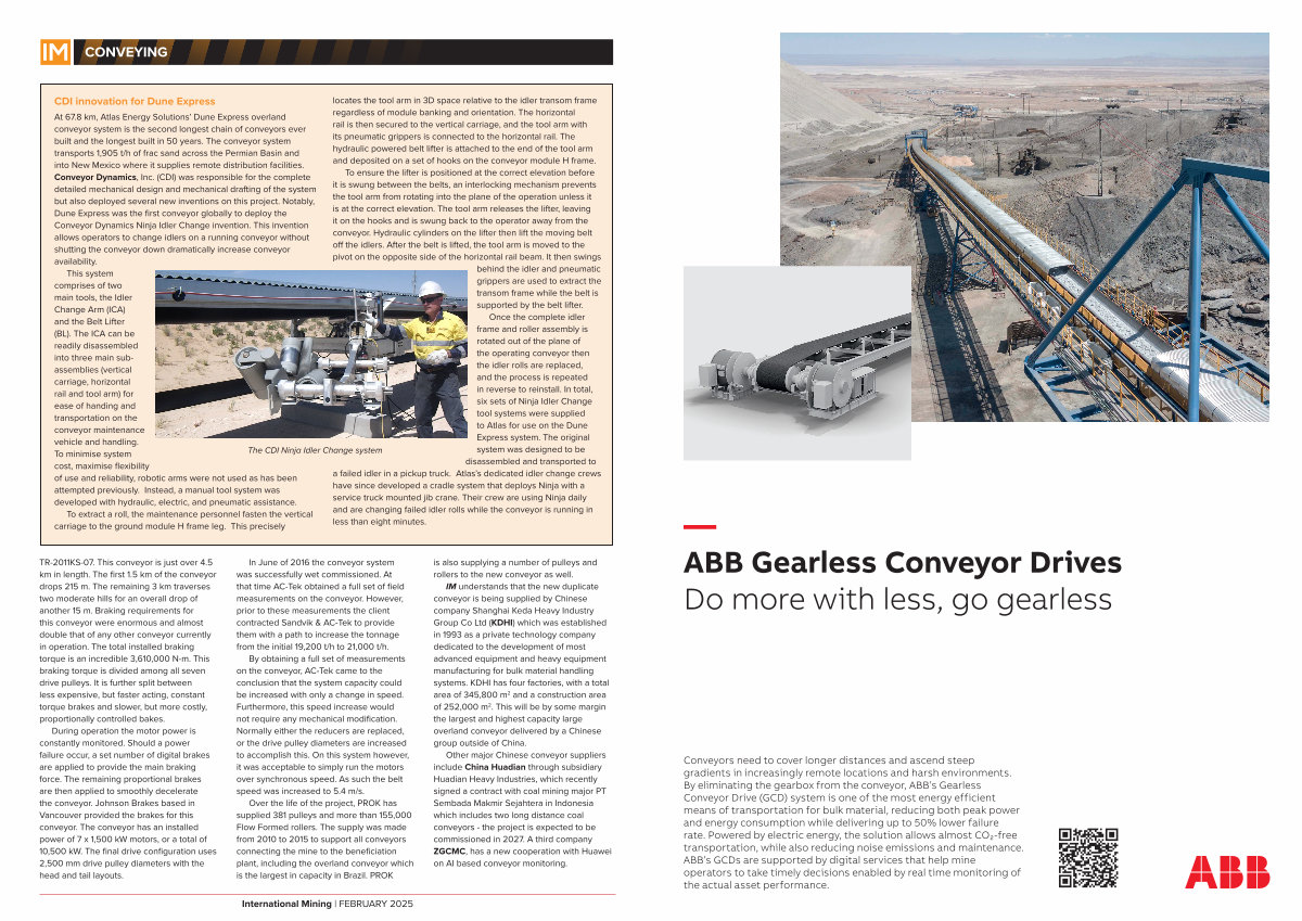 At 67.8 km, Atlas Energy Solutions’ Dune Express overland conveyor system is the second longest chain of conveyors ever built and the longest built in 50 years. The conveyor system transports 1,905 t / h of frac sand across the Permian Basin and into New Mexico where it supplies remote distribution facilities. Conveyor Dynamics, Inc.( CDI) was responsible for the complete detailed mechanical design and mechanical drafting of the system but also deployed several new inventions on this project. Notably, Dune Express was the first conveyor globally to deploy the Conveyor Dynamics Ninja Idler Change invention. This invention allows operators to change idlers on a running conveyor without shutting the conveyor down dramatically increase conveyor availability.