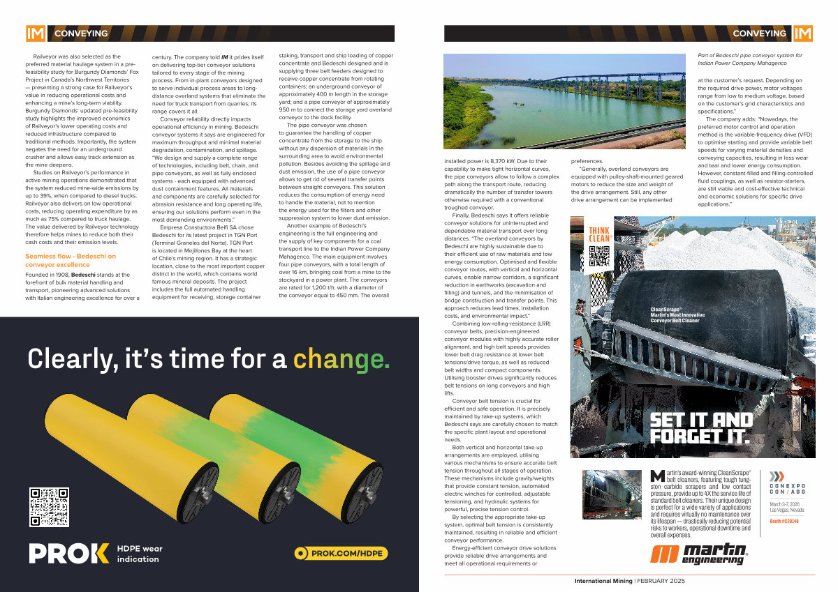 Finally, Bedeschi says it offers reliable conveyor solutions for uninterrupted and dependable material transport over long distances.“ The overland conveyors by Bedeschi are highly sustainable due to their efficient use of raw materials and low energy consumption. Optimised and flexible conveyor routes, with vertical and horizontal curves, enable narrow corridors, a significant reduction in earthworks( excavation and filling) and tunnels, and the minimisation of bridge construction and transfer points. This approach reduces lead times, installation costs, and environmental impact.”