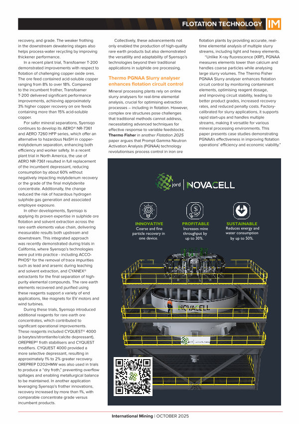 During these trials, Syensqo introduced additional reagents for rare earth ore concentrates, which contributed to significant operational improvements. These reagents included CYQUEST ® 4000( a barytes / strontianite / calcite depressant), OREPREP ® froth stabilisers and CYQUEST modifiers. CYQUEST 4000 provided a more selective depressant, resulting in approximately 1 % to 2 % greater recovery. OREPREP D202HMW was also used in trials to produce a“ dry froth,” preventing overflow spillages and enabling metallurgical balance to be maintained. In another application leveraging Syensqo’ s frother innovations, recovery increased by more than 1 %, with comparable concentrate grade versus incumbent products.