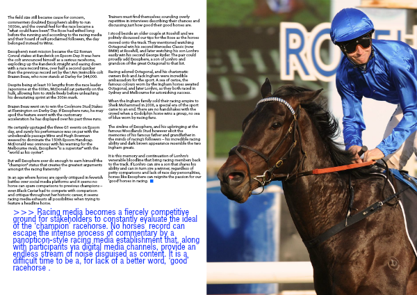 >>> Racing media becomes a fiercely competitive ground for stakeholders to constantly evaluate the ideal of the ‘champion’ racehorse. No horses’ record can escape the intense process of commentary by a panopticon-style racing media establishment that, along with participants via digital media channels, provide an endless stream of noise disguised as content. It is a difficult time to be a, for lack of a better word, ‘good’ racehorse .