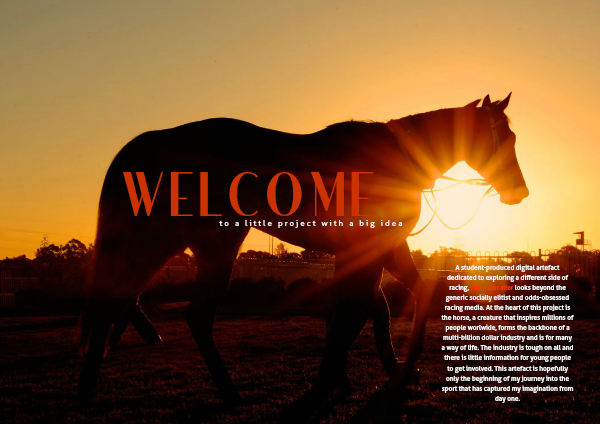 A student-produced digital artefact dedicated to exploring a different side of racing, The Racecaller looks beyond the generic socially elitist and odds-obsessed racing media. At the heart of this project is the horse, a creature that inspires millions of people worlwide, forms the backbone of a multi-billion dollar industry and is for many a way of life. The industry is tough on all and there is little information for young people to get involved. This artefact is hopefully only the beginning of my journey into the sport that has captured my imagination from day one.