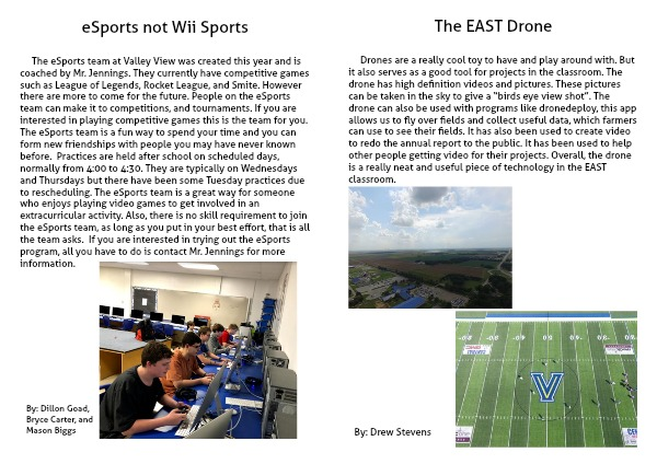 Drones are a really cool toy to have and play around with. But it also serves as a good tool for projects in the classroom. The drone has high definition videos and pictures. These pictures can be taken in the sky to give a “birds eye view shot”. The drone can also be used with programs like dronedeploy, this app allows us to fly over fields and collect useful data, which farmers can use to see their fields. It has also been used to create video to redo the annual report to the public. It has been used to help other people getting video for their projects. Overall, the drone is a really neat and useful piece of technology in the EAST classroom.