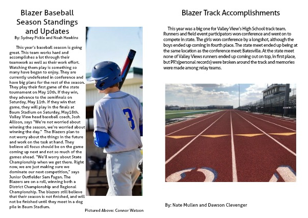 This year was a big one for Valley View’s High School track team. Runners and field event participators won conference and went on to compete in state. The girls won conference by a longshot, although the boys ended up coming in fourth place. The state meet ended up being at the same location as the conference meet: Batesville. At the state meet none of Valley Views runners ended up coming out on top, in first place, but PR's(personal records) were broken around the track and memories were made among relay teams.