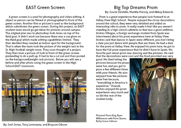 A green screen is a used for photography and video editing. A object or person can be filmed or photographed in front of the green screen. Another film or picture is used as the background which substitutes the green screen. During this project, an EAST student team would go get ideas for pictures around campus. The original plan was to photoshop Josh Jones on top of the field goal. It didn’t work out because there was a sun glare on the field goal which made editing capabilities limited. They then decided they needed an indoor spot for the background. That is when the team took the picture of the weight rack in the Sr. High football weight room. They soon thought of a project. They then took a picture of Josh in front of the green screen pretending to do a pull up. It had to be a cut out and then posted on the background(weight rack picture). Below you will see a before and after photo using the green screen in the High School EAST classroom.