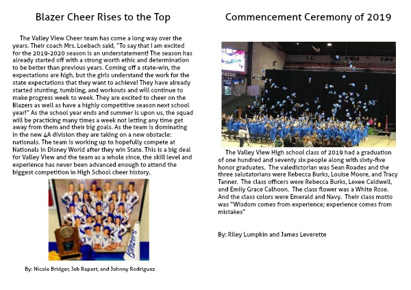 The Valley View Cheer team has come a long way over the years. Their coach Mrs. Loebach said, “To say that I am excited for the 2019-2020 season is an understatement! The season has already started off with a strong worth ethic and determination to be better than previous years. Coming off a state-win, the expectations are high, but the girls understand the work for the state expectations that they want to achieve! They have already started stunting, tumbling, and workouts and will continue to make progress week to week. They are excited to cheer on the Blazers as well as have a highly competitive season next school year!” As the school year ends and summer is upon us, the squad will be practicing many times a week not letting any time get away from them and their big goals. As the team is dominating in the new 4A division they are taking on a new obstacle: nationals. The team is working up to hopefully compete at Nationals in Disney World after they win State. This is a big deal for Valley View and the team as a whole since, the skill level and experience has never been advanced enough to attend the biggest competition in High School cheer history.