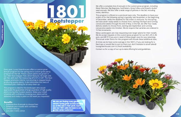 Every year , Lucas Greenhouses offers a custom grow annual program for the spring and a custom grow pansy program for the fall . These custom plants are grown in our 1801 Root Stepper Flats which features 18 single cells per flat , with each flat measuring 20 ” x10 ” x 3 5 / 8 ”. The Root Stepper promotes interior root pruning in stepped levels producing quality plants . It also eliminates the mess of individual pots making for an easy clean up .