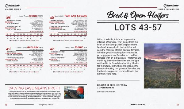 Without a doubt , this is an impressive offering of females . They come from the heart of the Spring Creek ’ s replacement herd and are no doubt the kind that will earn the moniker of front-pasture females . Whether you are looking for stout-made , yet soggy purebred females , or Lim-Flex females with an extra show of maternal and marbling , these bred females are the type and kind to be foundation building blocks for the future . Bid with confidence , as the genetics backing this group of females are tried-and-true proven commodities in the Spring Creeks herd .