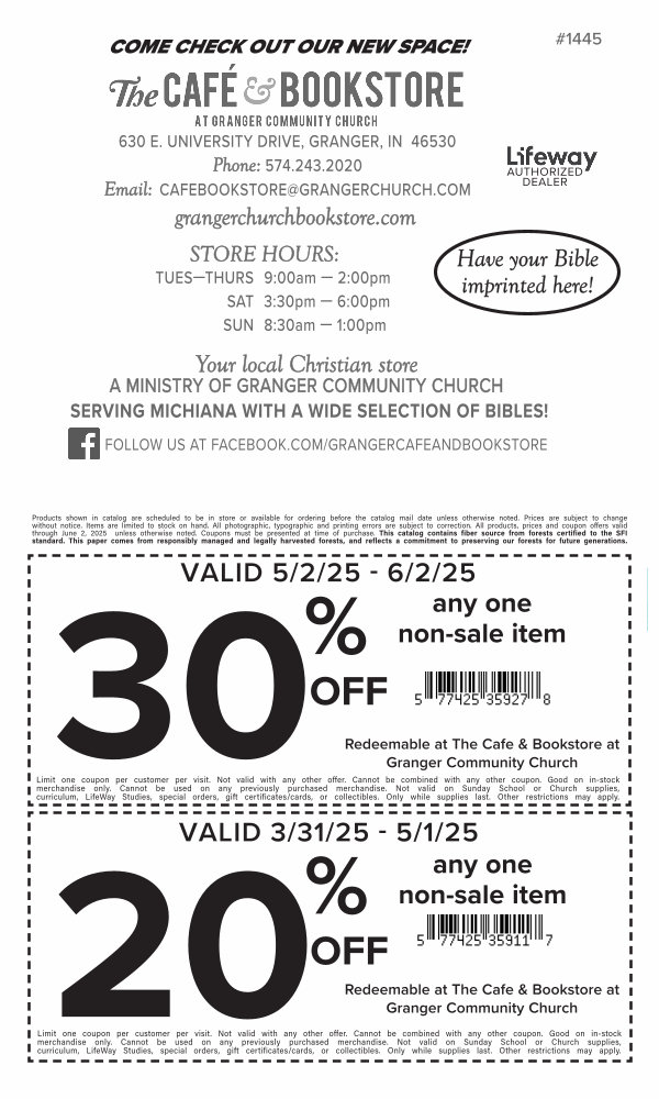 630 E . UNIVERSITY DRIVE , GRANGER , IN 46530 Phone : 574.243.2020 Email : CAFEBOOKSTORE @ GRANGERCHURCH . COM grangerchurchbookstore . com