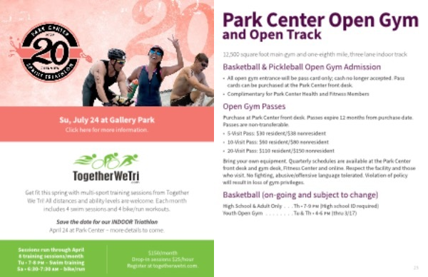 Bring your own equipment . Quarterly schedules are available at the Park Center front desk and gym desk , Fitness Center and online . Respect the facility and those who visit . No fighting , abusive / offensive language tolerated . Violation of policy will result in loss of gym privileges .
