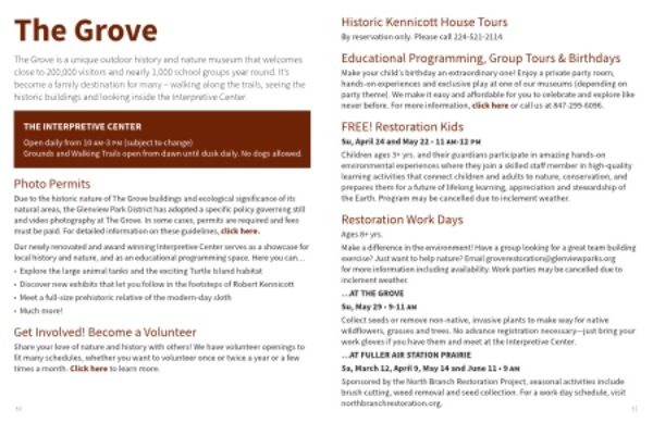Due to the historic nature of The Grove buildings and ecological significance of its natural areas , the Glenview Park District has adopted a specific policy governing still and video photography at The Grove . In some cases , permits are required and fees must be paid . For detailed information on these guidelines , click here .