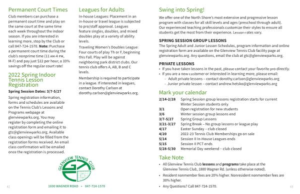 Spring registration information , forms and schedules are available on the Tennis Club ' s Lessons and Programs webpage at glenviewparks . org . You may register by completing the online registration form and emailing it to gtc @ glenviewparks . org . Available class openings will be filled from the registration forms received . An email class confirmation will be emailed once the registration is processed .