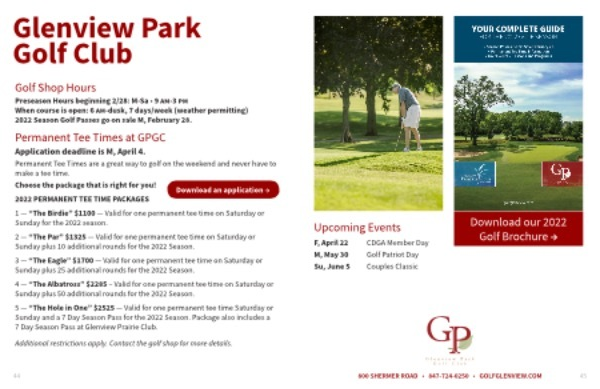 5 — “ The Hole in One ” $ 2525 — Valid for one permanent tee time Saturday or Sunday and a 7 Day Season Pass for the 2022 Season . Package also includes a 7 Day Season Pass at Glenview Prairie Club .