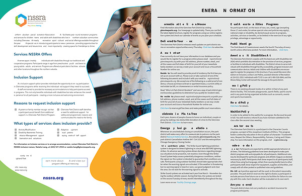 For information on Inclusion services or to arrange accommodation, contact Glenview Park District’ s NSSRA Inclusion Liaison, Natalie Liang, at( 224) 521-2552 or natalie. liang @ glenviewparks. org.