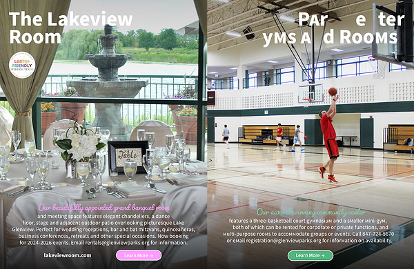 features a three-basketball court gymnasium and a smaller mini-gym, both of which can be rented for corporate or private functions, and multi-purpose rooms to accommodate groups or events. Call 847-724-5670 or email registration @ glenviewparks. org for information on availability.
