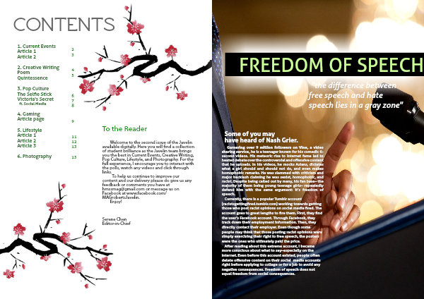 Welcome to the second issue of the Javelin available digitally. Here you will find a collection of student brilliance as the Javelin team brings you the best in Current Events, Creative Writing, Pop Culture, Lifestyle, and Photography. For the full experience, I encourage you to interact with the polls, watch any videos and click through links.