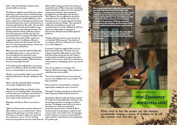 What a peculiar team! thought the king, who was fighting the urge to cover up his nose from the awful burnt smell. But as the Inventor and her assistant approached closer, the king exclaimed amiably, ”Welcome! How have you been, Elish Echtin?”