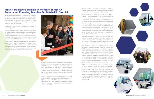 A champion for the needs of NSSRA participants and families , Dr . Slotnick had long supported securing a permanent location for NSSRA . He remained active with the Association and served on the Foundation Board until his passing in 2018 . The Slotnick Family ’ s generous donation of $ 1.15 million in his memory was crucial in funding NSSRA ’ s building purchase and renovation .