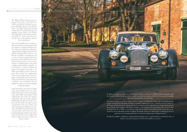 The renowned TOK 258 was finished in dark green , while a particular shade of red was popular on motorsport Morgan vehicles of the time , and these two colours have inspired the hues available on the Plus Four LM62 . A Heritage White hardtop – just like the one fitted to the famous race car – comes as standard , marking the first time this item has been available for the model . Further paying homage to the victorious Morgan is an LM62 graphics pack , which includes roundels with the number ‘ 29 ’ – as per TOK 258 – as well as an LM62 rear badge , silver-painted wire wheels , a Le Mans-style fuel filler cap and a domed rear panel . These touches are complemented by driving spot lights , body-coloured A- pillars , a black splitter and cowl mesh , polished stoneguard , black mohair sidescreens , a sidescreen bag embroidered with the LM62 logo , and an active sports exhaust with black tailpipes .