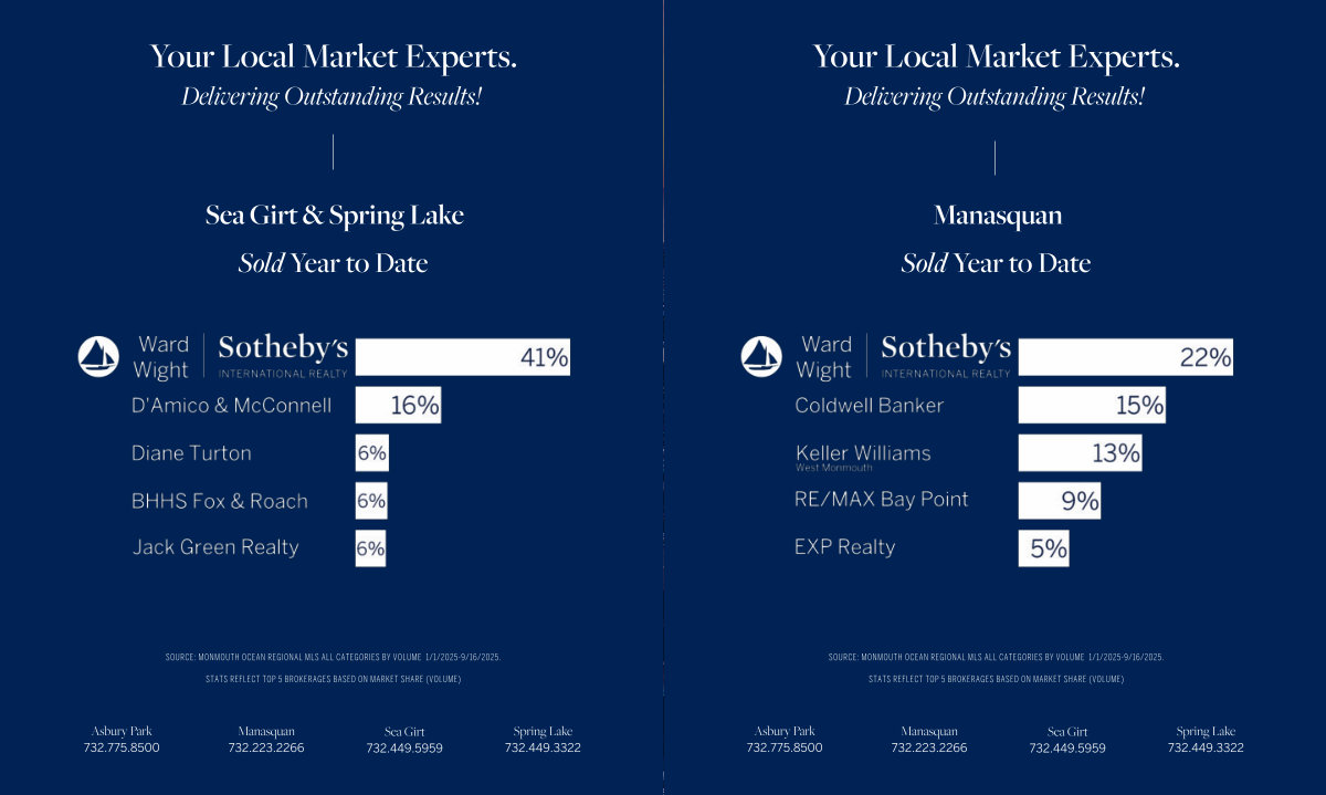 SOURCE: MONMOUTH OCEAN REGIONAL MLS ALL CATEGORIES BY VOLUME 1 / 1 / 2025-9 / 16 / 2025. STATS REFLECT TOP 5 BROKERAGES BASED ON MARKET SHARE( VOLUME)