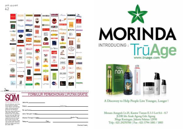 Laju perkembangan gaya hidup telah menjadikan berbagai macam tempat usaha berlombalomba untuk mempromosikan pelayanan dan fasilitasnya. Bagi Anda yang memiliki tempat usaha seperti restoran, cafe, toko buku, salon, spa, boutique, dan klub olah raga. SQM ingin mengajak Anda bekerja sama menghadirkan liputan sebagai ajang promosi tempat usaha Anda. Untuk kesempatan liputan yang bersifat gratis, silahkan isi formulir di samping dan fax ke( 021) 5835 5081 |
