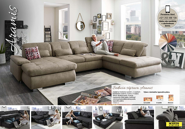 moderný modulový systém , s vysokým komfortom sedenia , kostra z tvrdého dreva , studená pena , funkcia nastavenia hĺbky sedu , možnosť individuálneho plánovania podľa typového plánu