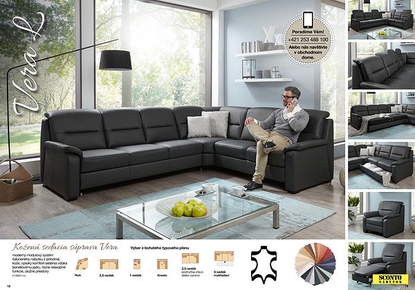 moderný modulový systém čalúneného nábytku z prírodnej kože , vysoký komfort sedenia vďaka bonellovému jadru , rôzne relaxačné funkcie , úložné priestory