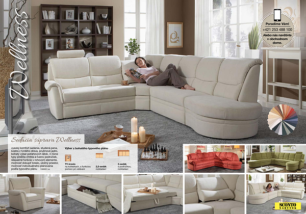 vysoký komfort sedenia , studená pena , kostra z tvrdého dreva , pružinové jadro , bohatý výber poťahových látok , 4 rôzne typy prešitia chrbta a tvarov podrúčiek , relaxačné funkcie v rohovom elemente , možnosť dokúpiť kreslo , úložný priestor , možnosť individuálneho plánovania podľa typového plánu 1369051 . xx