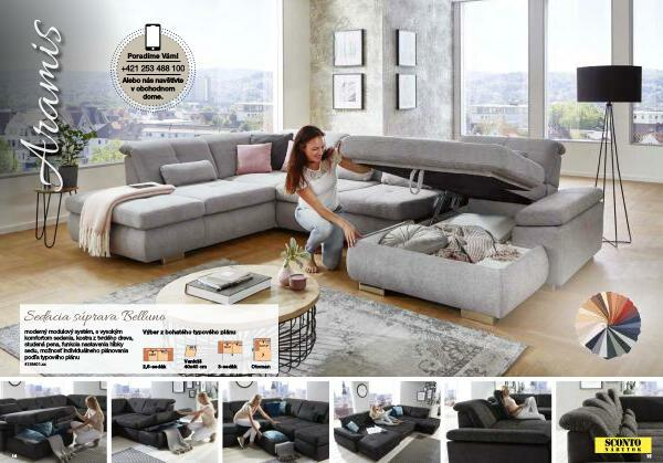 moderný modulový systém , s vysokým komfortom sedenia , kostra z tvrdého dreva , studená pena , funkcia nastavenia hĺbky sedu , možnosť individuálneho plánovania podľa typového plánu