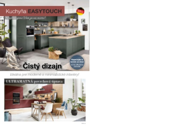 Čistý dizajn kuchyne EASYTOUCH je ideálny pre moderné a minimalistické interiéry . Najvýraznejším prvkom je jej ultramatná povrchová úprava , ktorú je možné zvoliť vo vyhotovení hrdzavá červená alebo grafitová čierna . Predné plochy sú vybavené inovatívnou technológiou ANTIFINGERPRINT , vďaka ktorej sa stanú odtlačky prstov minulosťou . Na výber máte zo širokej ponuky možných vyhotovení pracovných dosiek a rúčok , alebo môžete zvoliť bezrúčkové riešenie LINE N pre ešte čistejší vzhľad .