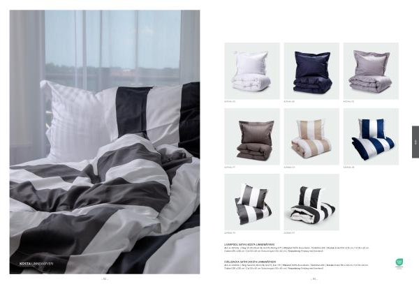 FJÄLLBACKA SATIN | KOSTA LINNEWÄFVERI Art . nr : 420844 | Färg : Sand 03 , Marin 58 , Grå 95 , Svart 99 | Material : 100 % Bomullsatin . Trådtäthet 200 | Storlek : Enkel 150 x 210 cm / 1 st 50 x 60 cm . Dubbel 230 x 220 cm / 2 st 50 x 60 cm . Extra örngott : 50 x 60 cm | Förpackning : Polybag med banderoll