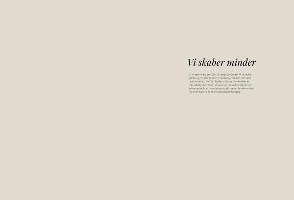 Vi vil gøre mere end blot at sælge produkter. Vi vil skabe glæde og minder gennem holdbare produkter, der varer i generationer. Derfor tilbyder vi dig og dine kunder et nøje udvalgt sortiment af gaver og højkvalitets hjem- og køkkenprodukter, hvor design og stil møder funktionalitet, for en smukkere og mere bæredygtig hverdag.