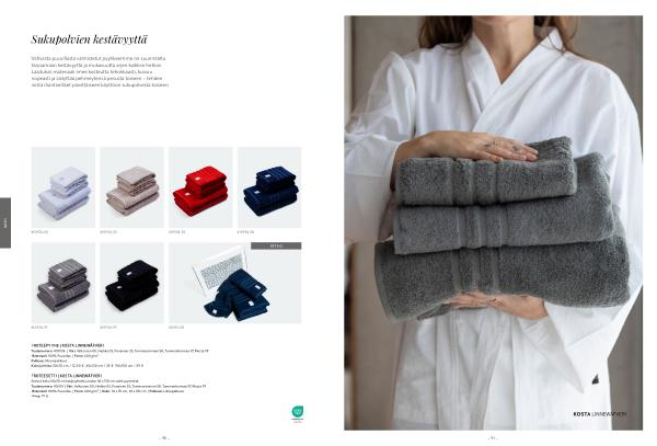FROTEEPYYHE | KOSTA LINNEWÄFVERI Tuotenumero: 410934 | Väri: Valkoinen 00, Hiekka 03, Punainen 35, Tummansininen 58, Tummanharmaa 97, Musta 99 Materiaali: 100 % Puuvillaa | Paino: 600 g / m ² Pakkaus: Muovipakkaus Koko ja hinta: 50x70 cm / 12,50 €. 65x130 cm / 25 €. 90x150 cm / 39 €