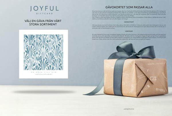 Ibland kan det vara svårt att hitta en gåva som passar alla, men med Joyful Giftcard blir det enkelt. Med våra gåvokort får mottagaren själv välja sin gåva bland hundratals produkter från välkända varumärken. Vi har lång erfarenhet av uppskattade gåvor och vet att alla kunder har olika behov, därför erbjuder vi en flexibel produkt som i alla steg kan anpassas efter era önskemål. Med två olika korttyper och flertalet valörer finns det ett Joyful Giftcard för alla tillfällen. Här är några av våra varumärken; Orrefors, Sagaform, Byon, Kosta Boda, Kosta Linnewäfveri, Cutter & Buck, Edblad, By Jolima, Craft, IsaDora, Lord Nelson, Orrefors Jernverk, Remington och Clique.