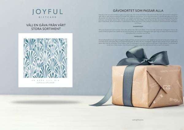Ibland kan det vara svårt att hitta en gåva som passar alla, men med Joyful Giftcard blir det enkelt. Med våra gåvokort får mottagaren själv välja sin gåva bland hundratals produkter från välkända varumärken. Vi har lång erfarenhet av uppskattade gåvor och vet att alla kunder har olika behov, därför erbjuder vi en flexibel produkt som i alla steg kan anpassas efter era önskemål. Med två olika korttyper och flertalet valörer finns det ett Joyful Giftcard för alla tillfällen. Här är några av våra varumärken; Orrefors, Sagaform, Byon, Kosta Boda, Kosta Linnewäfveri, Cutter & Buck, Edblad, By Jolima, Craft, IsaDora, Lord Nelson, Orrefors Jernverk, Remington och Clique.
