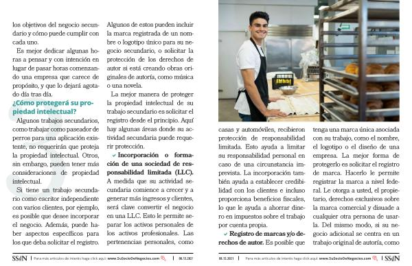 Algunos de estos pueden incluir la marca registrada de un nombre o logotipo único para su negocio secundario , o solicitar la protección de los derechos de autor si está creando obras originales de autoría , como música o una novela . La mejor manera de proteger la propiedad intelectual de su trabajo secundario es solicitar el registro desde el principio . Aquí hay algunas áreas donde su actividad secundaria puede requerir protección . �Incorporación o formación de una sociedad de responsabilidad limitada ( LLC ). A medida que su actividad secundaria comience a crecer y a generar más ingresos y clientes , será clave convertir el negocio en una LLC . Esto le permite separar los activos personales de los activos profesionales . Las pertenencias personales , como