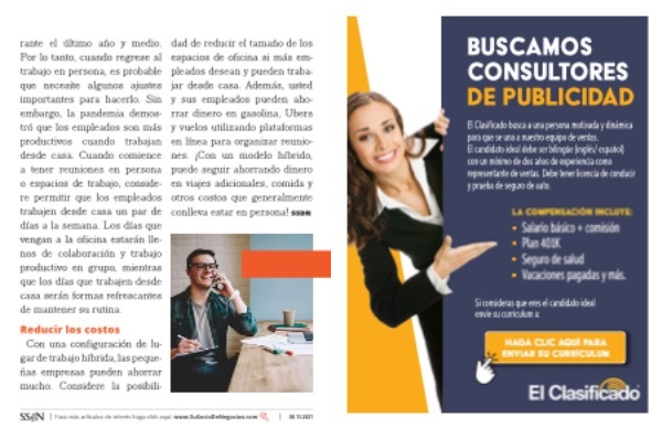 El Clasificado busca a una persona motivada y dinámica para que se una a nuestro equipo de ventas . El candidato ideal debe ser bilingüe ( inglés / español ) con un mínimo de dos años de experiencia como representante de ventas . Debe tener licencia de conducir y prueba de seguro de auto .