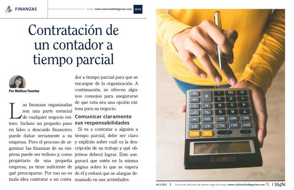 Las finanzas organizadas son una parte esencial de cualquier negocio exitoso . Incluso un pequeño paso en falso o descuido financiero puede dañar seriamente a su empresa . Pero el proceso de organizar las finanzas de su empresa puede ser tedioso y , como propietario de una pequeña empresa , ya tiene suficiente de qué preocuparse . Por eso no es mala idea contratar a un conta- dor a tiempo parcial para que se encargue de la organización . A continuación , se ofrecen algunos consejos para asegurarse de que esta sea una opción exitosa para su negocio .
