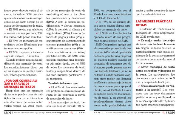 El Informe de Tendencias de Mensajes de Texto Empresariales 2021 revela que : �Es mejor enviar mensajes de texto más tarde en la semana . Según las tasas de clics , la participación fue más baja al comienzo de la semana y aumentó de manera constante durante el fin de semana . �Envíe mensajes de texto antes del trabajo y después de la cena . La participación fue dos veces mayor antes de las 9 a . m . y después de las 9 p . m . �Sea claro acerca de su “ llamado a la acción ”. Los mensajes con un tono claramente positivo o serio y un llamado a la acción específico ( CTA ) tuvieron hasta tres veces más partici-