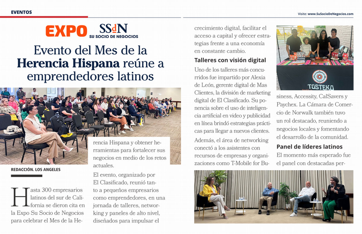 Hasta 300 empresarios latinos del sur de California se dieron cita en la Expo Su Socio de Negocios para celebrar el Mes de la Herencia Hispana y obtener herramientas para fortalecer sus negocios en medio de los retos actuales. El evento, organizado por El Clasificado, reunió tanto a pequeños empresarios como emprendedores, en una jornada de talleres, networking y paneles de alto nivel, diseñados para impulsar el