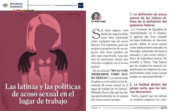 dueño de negocio debe estar bien informado sobre cualquier tipo de acoso laboral . Por supuesto , para las mujeres propietarias de un negocio , este tema pueden ser aún más importante . Las latinas en particular tienen una relación compleja con el acoso sexual . En su artículo " NO LO CON- SIDERAMOS COMO ACO- SO SEXUAL ": La intersección de género y etnicidad en las denuncias de acoso sexual en el lugar de trabajo de las latinas ”, Waleska Suero dijo que las latinas generalmente no se quejan del acoso sexual porque :