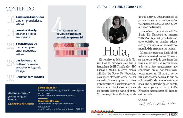 Mi nombre es Martha de la Torre . Soy la directora ejecutiva y fundadora de El Clasificado | EC Hispanic Media . Nuestra marca afiliada , Su Socio De Negocios , está increíblemente cerca de mi corazón . Como empresaria latina y propietaria de un negocio , entiendo cuántos obstáculos aparecen en nuestro camino hacia el éxito . Sin embargo , también he aprendi-